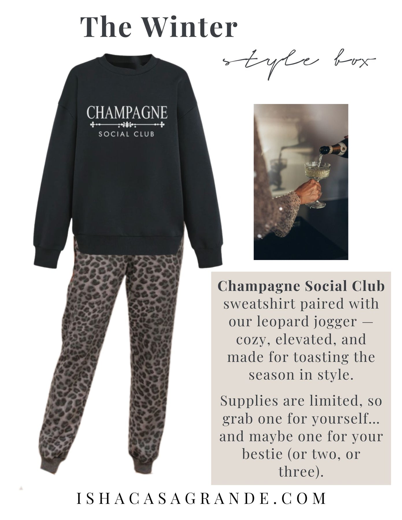 Inside, you’ll find the cozy Champagne Social Club sweatshirt paired with the cutest leopard jogger for an effortlessly chic winter look that’s perfect for lounging, layering, and celebrating all season long.
