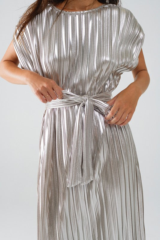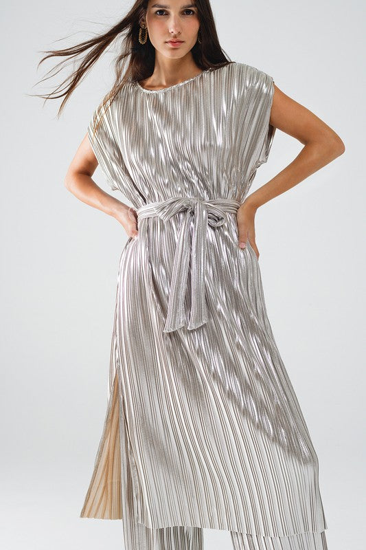 This Metallic Tunic Dress features a relaxed fit enhanced by side slits for ease of movement and flattering layering. The self-tie belt allows for customizable shaping, making it versatile enough to dress up for elegant occasions or down for casual wear. Crafted to blend comfort with sophisticated style, it is an ideal addition to any wardrobe seeking effortless chic. Pre-order now to elevate your collection with this adaptable piece.
