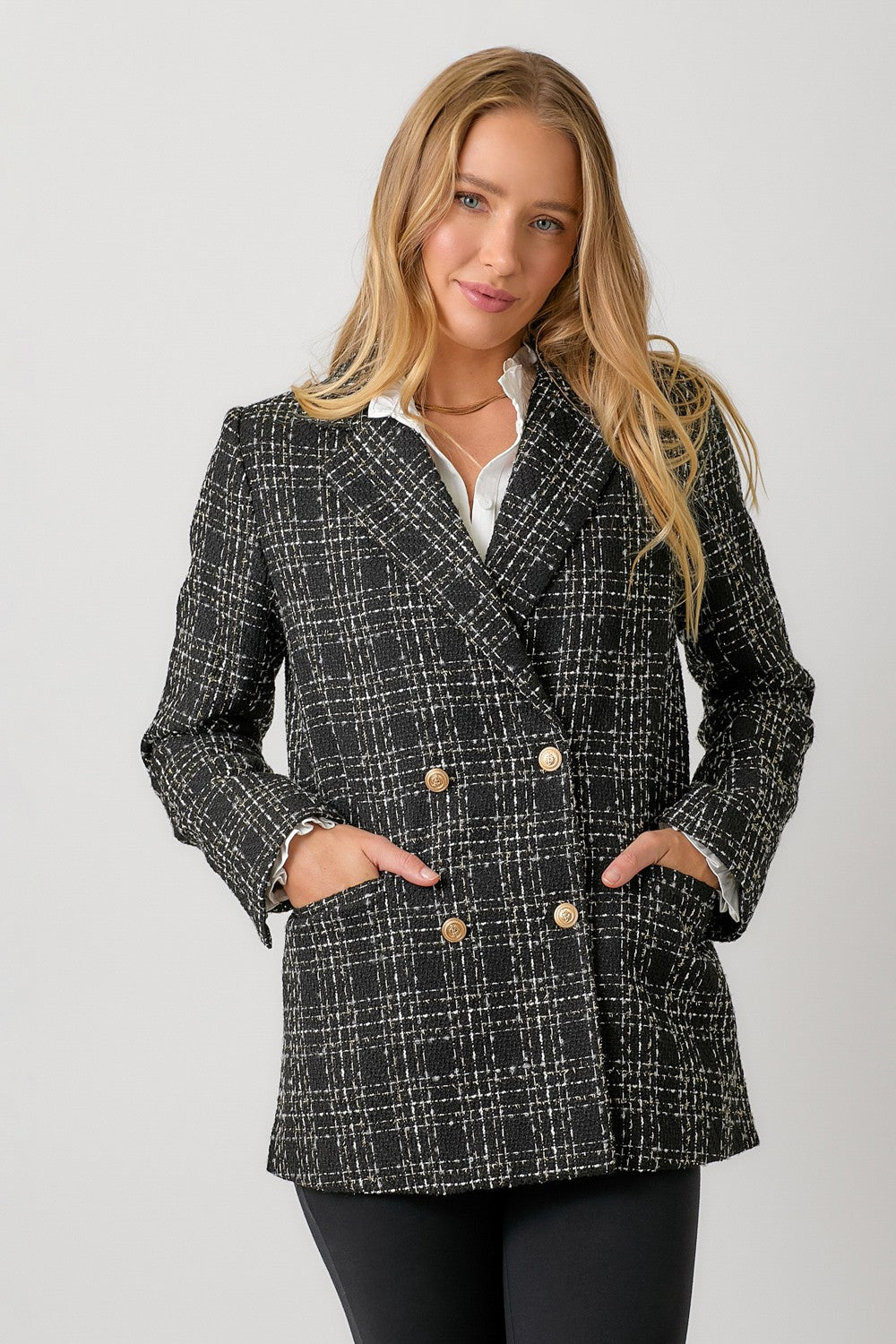 Step into your style power with this commanding tweed jacket, a true statement piece designed for instant Confidence. This is not just a layer—it's the focal point of your ensemble, blending classic structure with luxurious, modern texture. Beautiful black and gold plaid. Fits true to size.