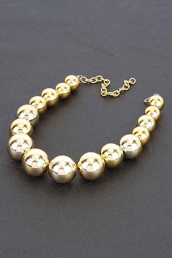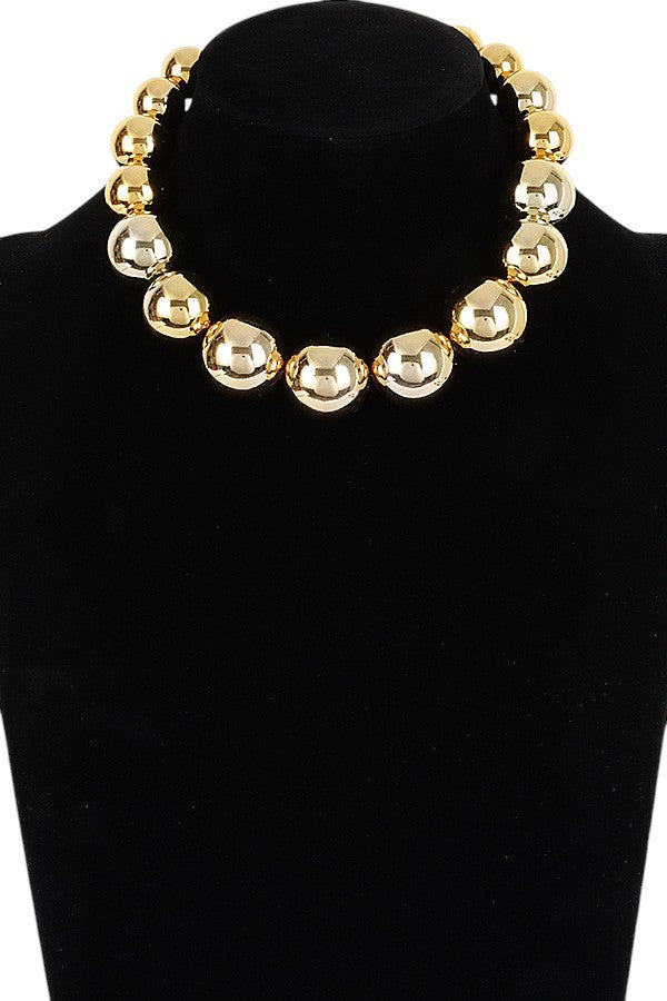 A versatile staple defined by its striking oversized silhouette and effortless modern luster. This collar-style necklace features a uniform row of high-shine metallic beads, offering a look that feels both bold and easy. Crafted from lightweight CCB material for comfortable, all-day wear, it transitions seamlessly from a casual daytime look over a high-neck bodysuit to an elevated evening ensemble as a sophisticated, polished statement.