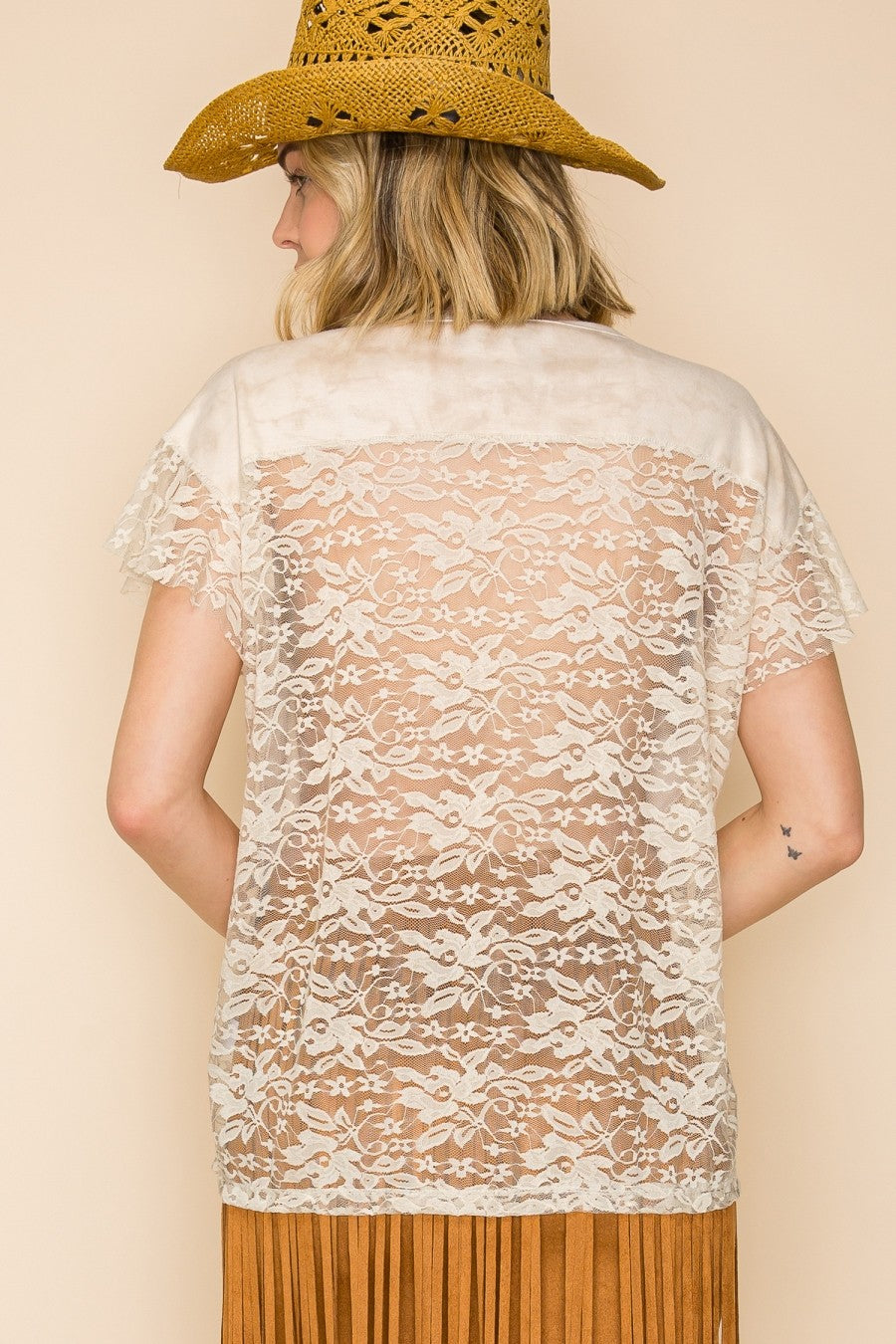 A versatile staple defined by its striking tie-dye wash and effortless romantic flair. This round-neck top features delicate ruffled lace sleeves and an intricate lace back panel, offering a silhouette that feels both bohemian and easy. Designed with a soft knit blend for comfort, it transitions seamlessly from a casual daytime look with cut-off shorts to an elevated evening ensemble paired with a suede skirt and boots.