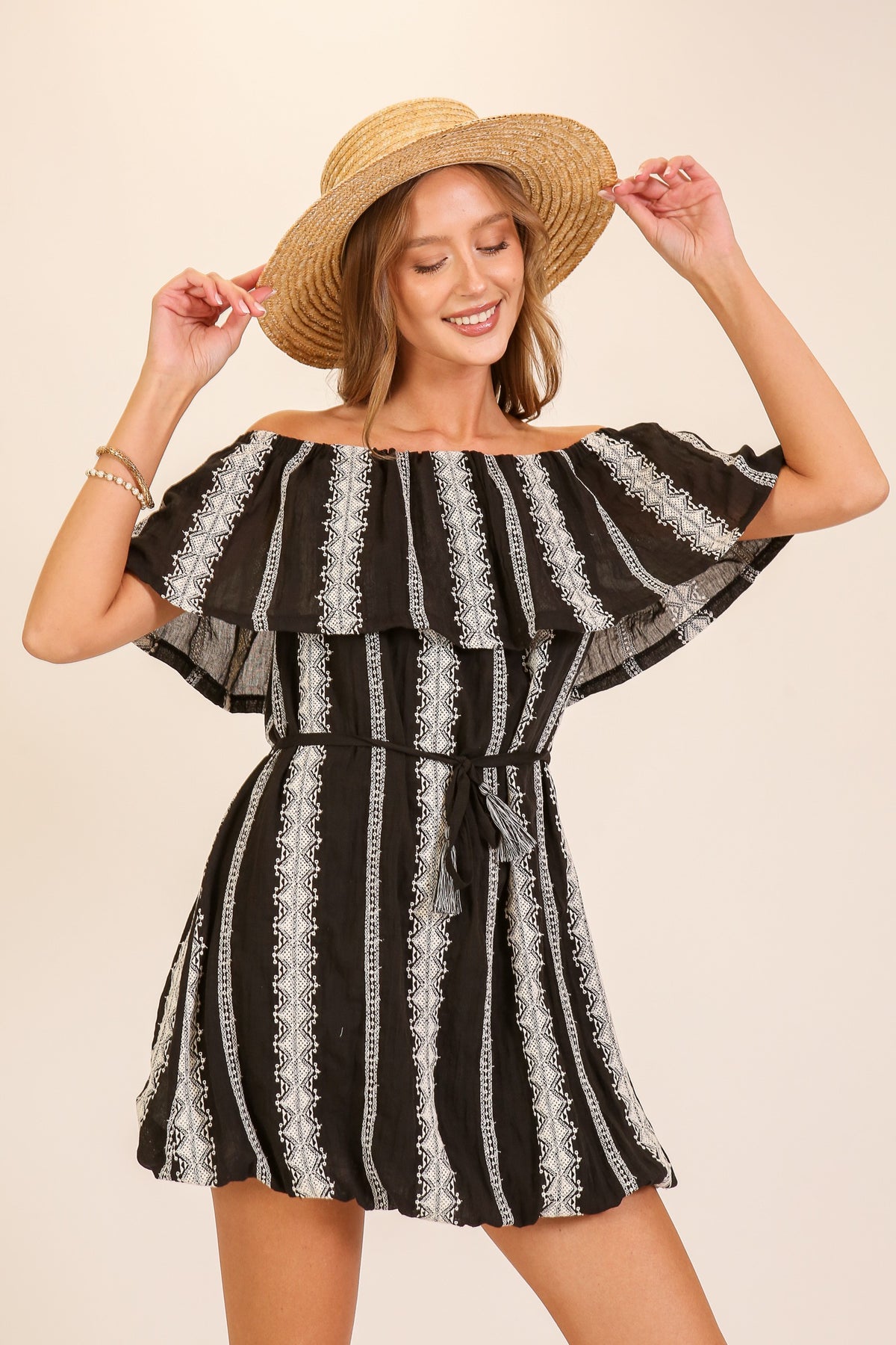 A versatile staple defined by its striking geometric embroidery and effortless off-shoulder silhouette. This mini features a ruffled neckline overlay and a cinched waist, offering a silhouette that feels both bohemian and easy. Designed with a lightweight, breathable fabric for comfort, it transitions seamlessly from a casual daytime look with a straw hat and sandals to an elevated evening ensemble with wedges and statement earrings.