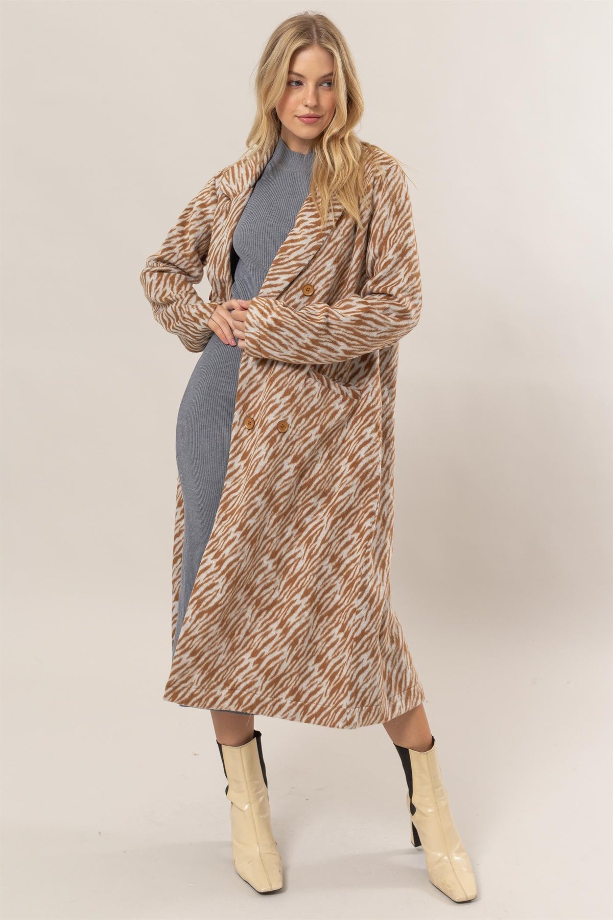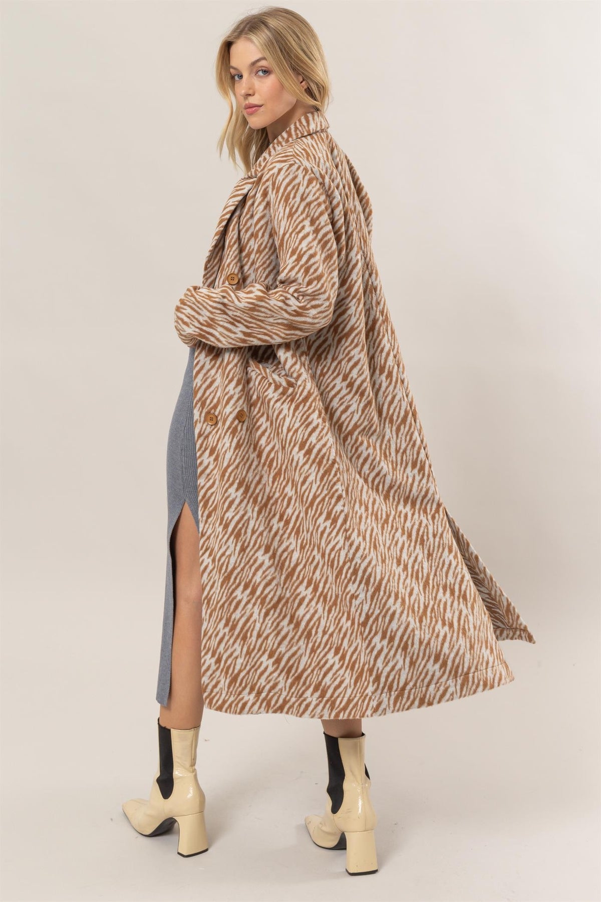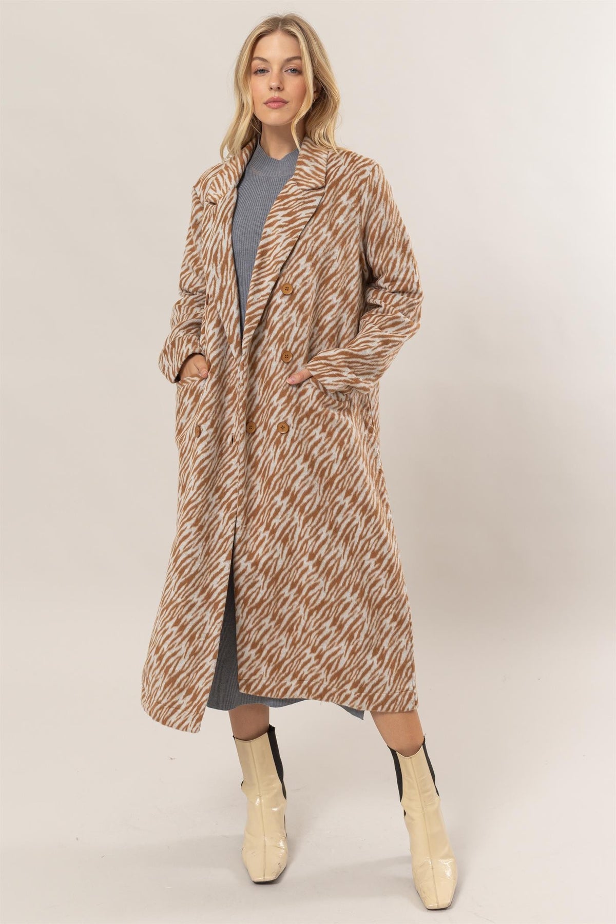 Elevate your wardrobe with this brushed long coat, where refined tailoring meets bold design. The striking zebra pattern commands attention, while notched lapels and structured shoulders deliver timeless sophistication. Double-breasted closure and functional slit pockets provide both style and practicality, making this piece an essential layer for the discerning dresser.